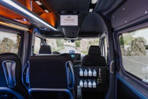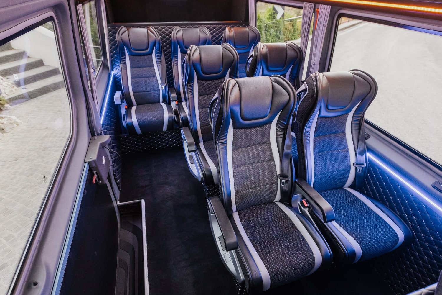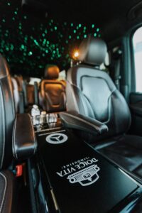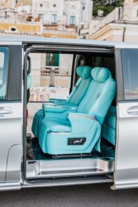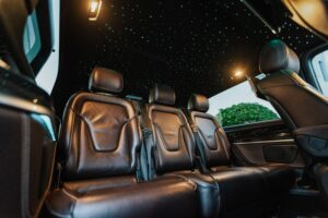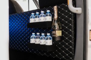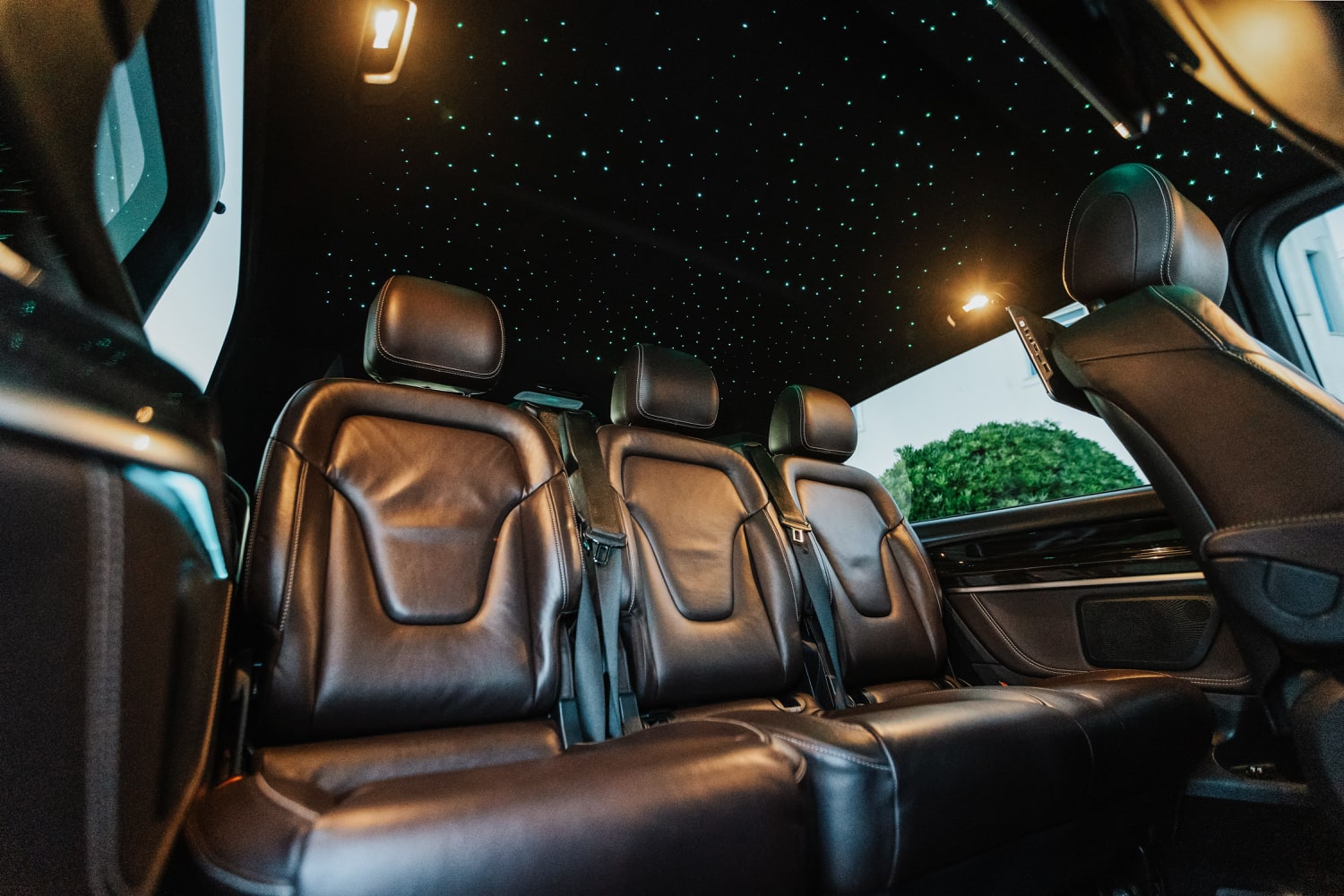 The epitome of spaciousness and comfort for up to 8 passengers. With ample room to stretch out and relax, this vehicle features reclining seats and unique ambient lighting to enhance your journey. Its standout feature lies in its remarkable capacity, with the luggage compartment accommodating approximately 18 bags, making it an ideal choice for families or groups of friends traveling together. Whether you’re embarking on a weekend getaway or a group excursion, the Mercedes Sprinter ensures a smooth and enjoyable ride for everyone on board. Stay connected with unlimited Wi-Fi and indulge in refreshments from the built-in minibar as you relax in style (water and Prosecco always included).