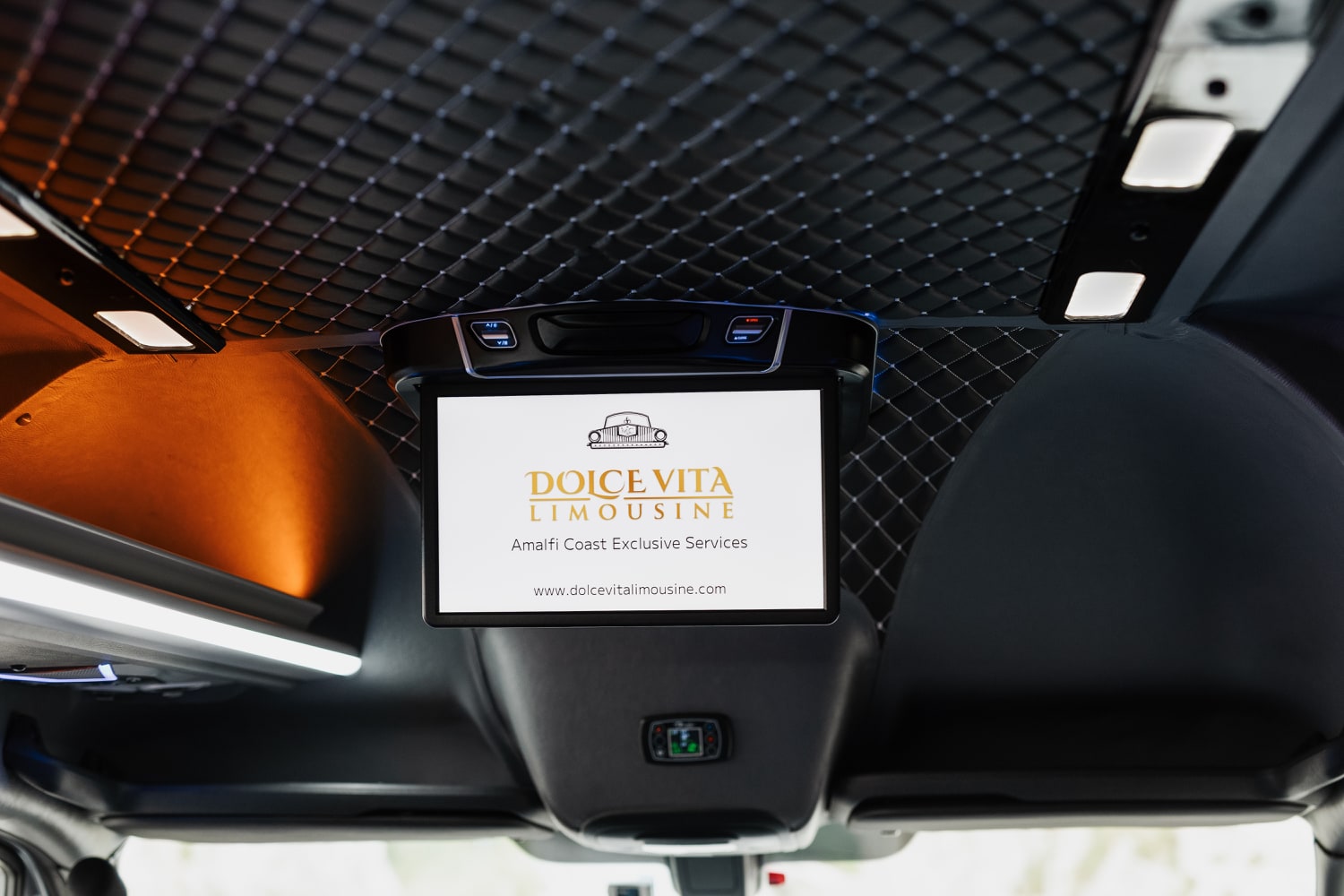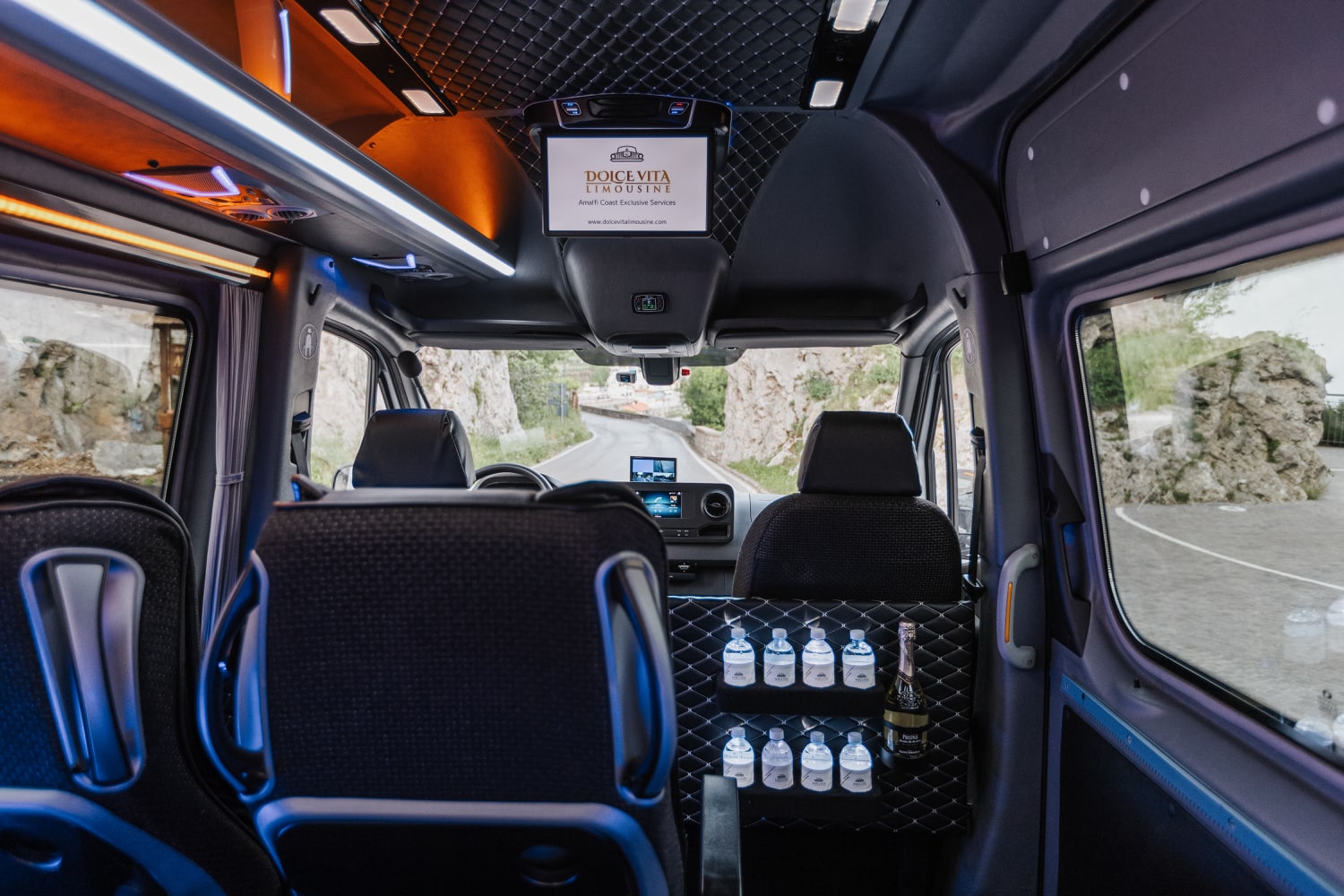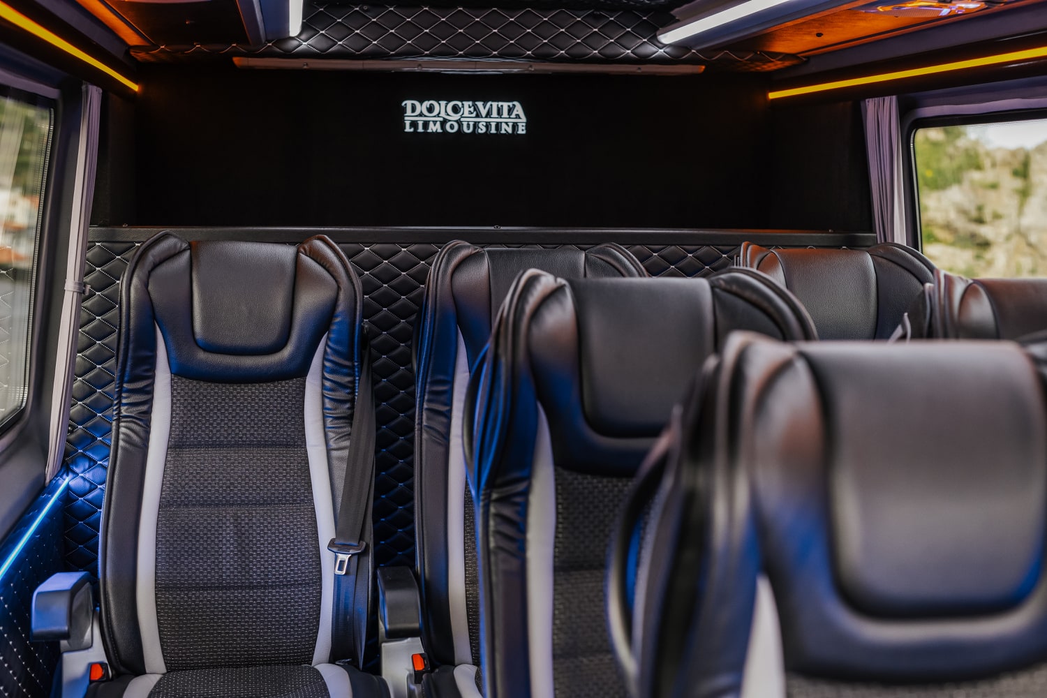 A pinnacle of luxury and refinement. Customized to perfection, it features a unique design that exudes sophistication at every turn. The interior is adorned with multi-tonal shades of brown leather upholstery, adding a touch of warmth and elegance to your journey. Stay connected with unlimited Wi-Fi and indulge in refreshments from the built-in minibar (water and Prosecco always included) as you relax in style. Entertainment is at your fingertips with the individual 9-inch touch-screen-TV fitted in each seat, perfect for enjoying your favorite shows or entertain your children. With Dolce Vita Limousine, elevate your travel experience to a new standard of comfort and class.