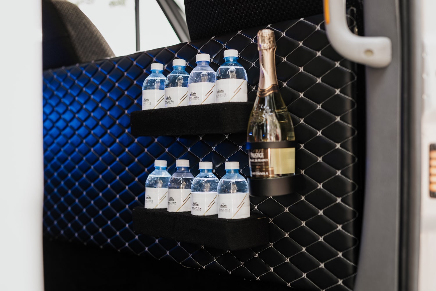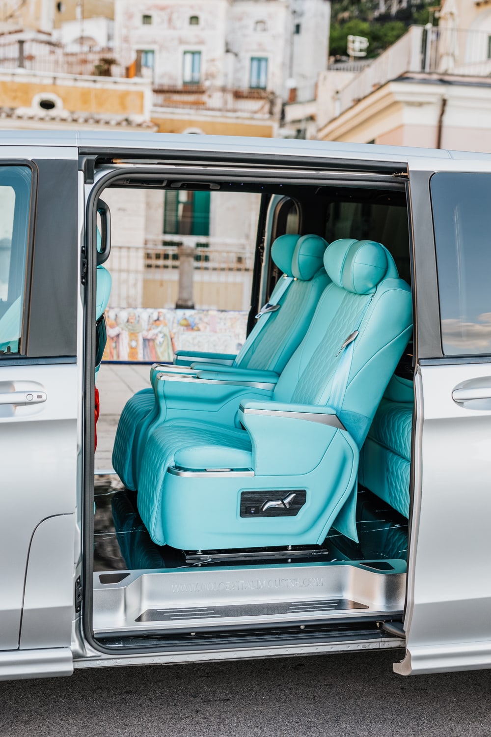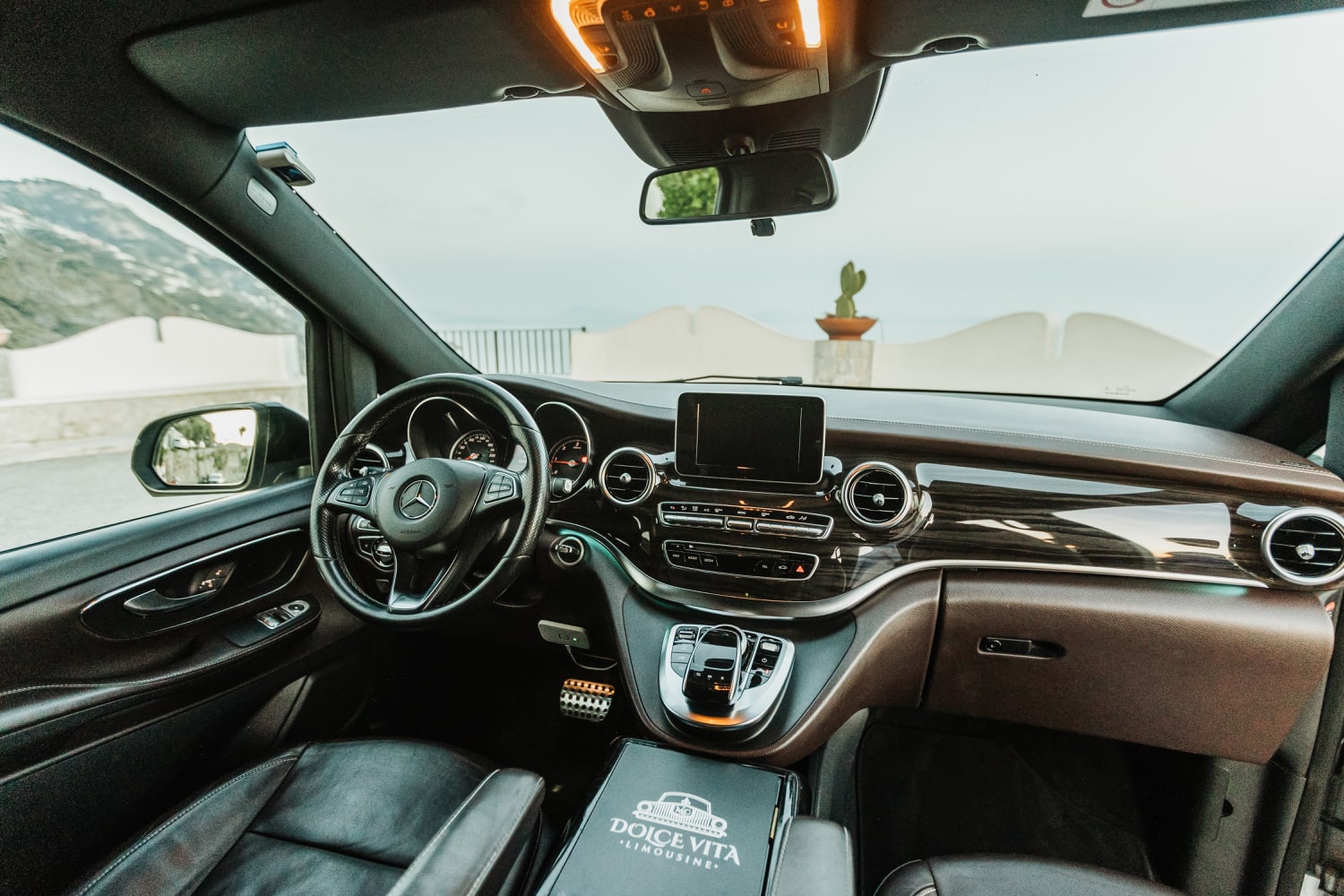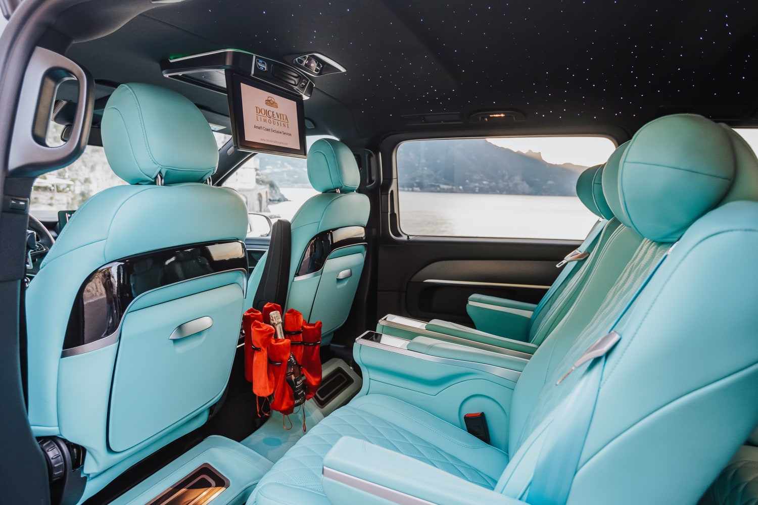 A pinnacle of luxury and refinement. Customized to perfection, it features a unique design that exudes sophistication at every turn. The interior is adorned with multi-tonal shades of brown leather upholstery, adding a touch of warmth and elegance to your journey. Stay connected with unlimited Wi-Fi and indulge in refreshments from the built-in minibar (water and Prosecco always included) as you relax in style. Entertainment is at your fingertips with the individual 9-inch touch-screen-TV fitted in each seat, perfect for enjoying your favorite shows or entertain your children. With Dolce Vita Limousine, elevate your travel experience to a new standard of comfort and class.
