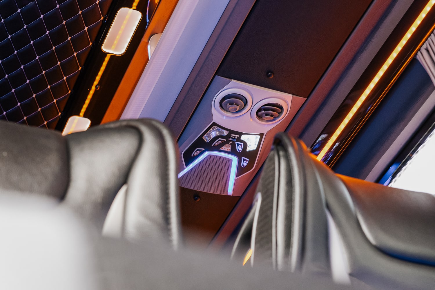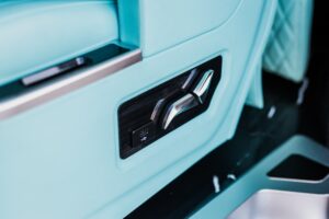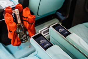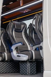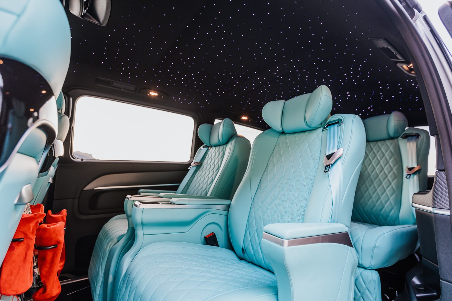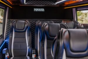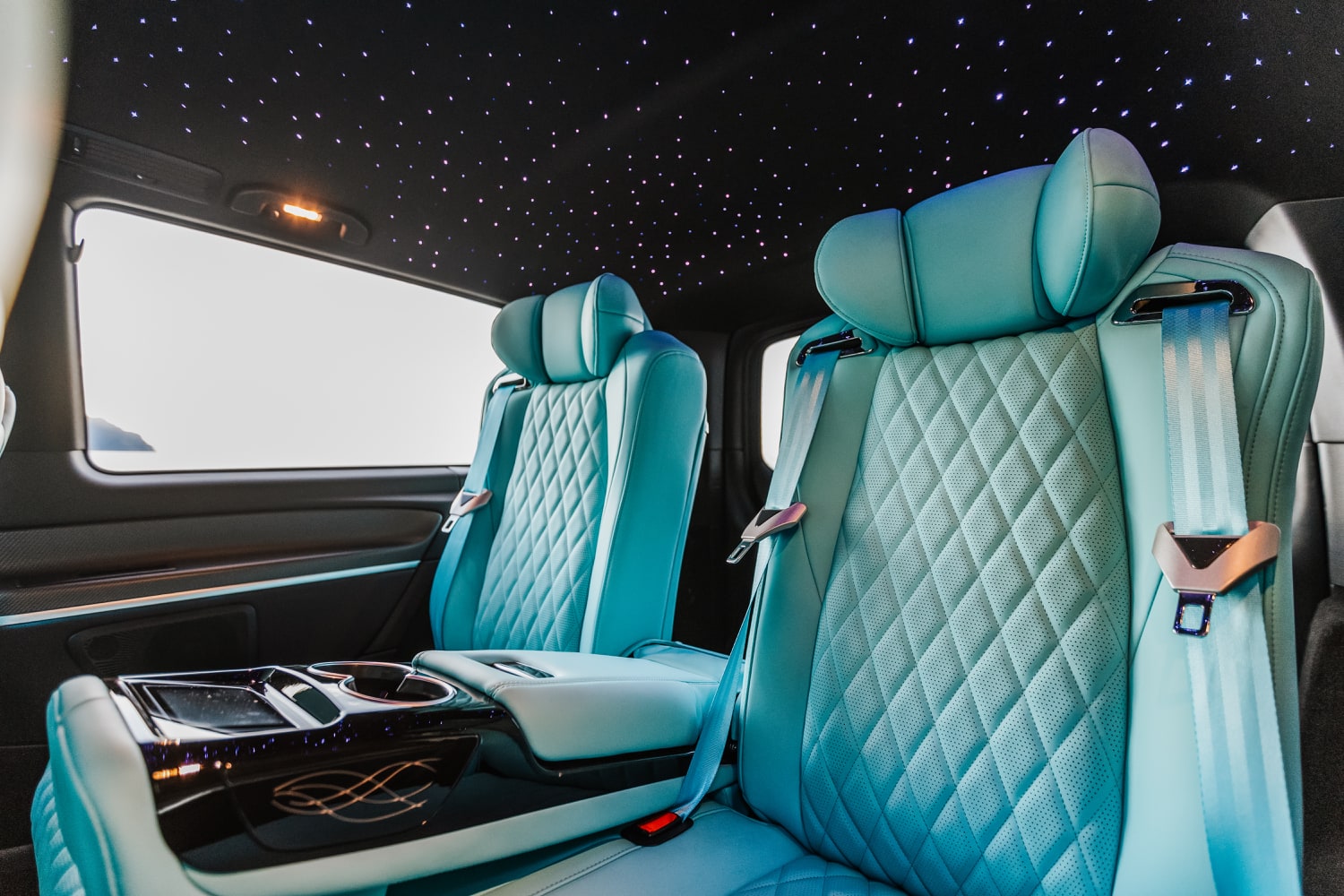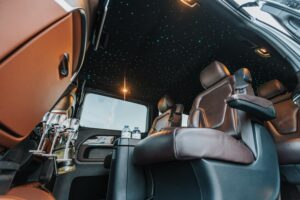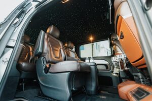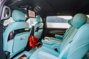 This marvel of engineering is meticulously customized, boasting individual reclining seats with cooling, heating, and massage features for a journey tailored to your every need. The interior exudes extravagance, with striking black marble flooring and sumptuous Tiffany-colored leather upholstery and starry sky ceiling. Stay seamlessly connected with unlimited Wi-Fi and delight in complimentary refreshments from the built-in minibar. Entertainment options are endless, thanks to the 16-inch TV, ideal for streaming Netflix or catching live sports events during your travels.